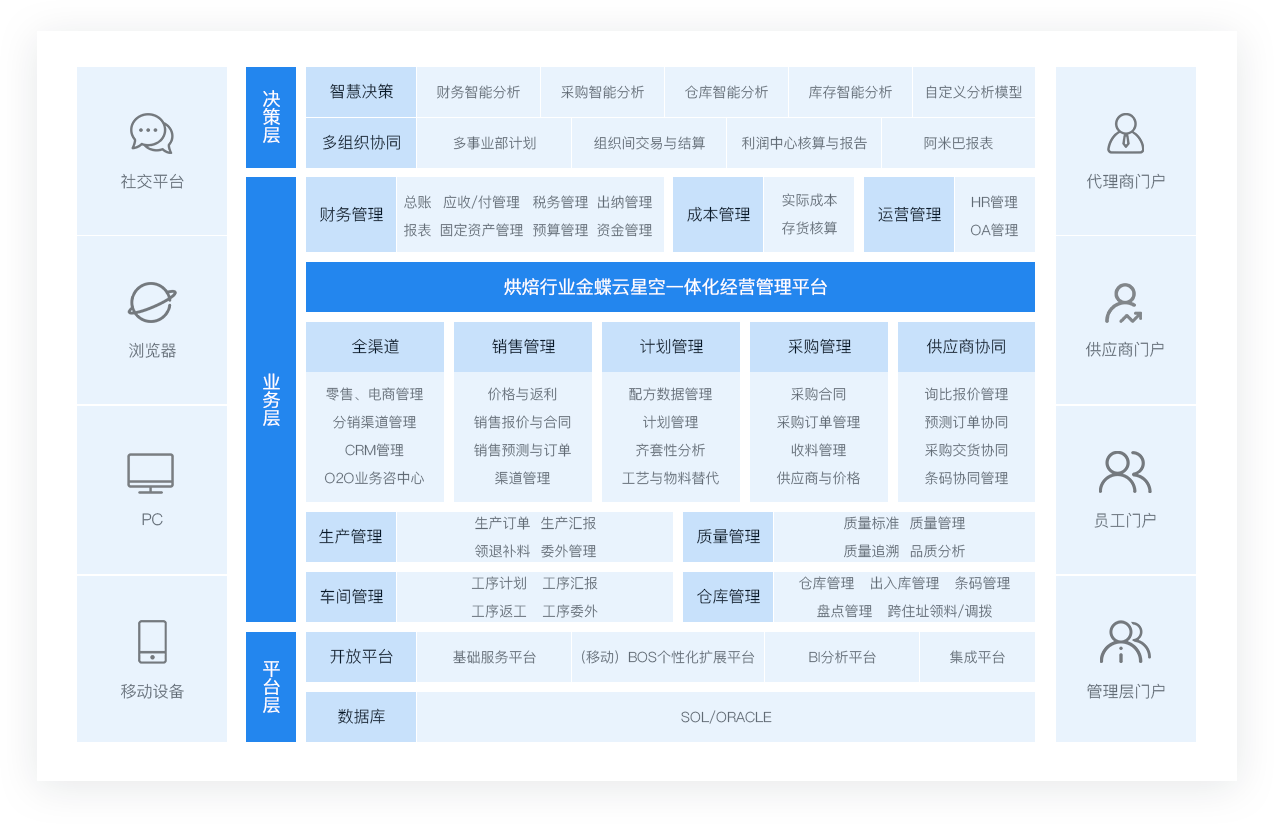 基于對(duì)烘焙連鎖行業(yè)長(zhǎng)期、深入的調(diào)研和細(xì)致的業(yè)務(wù)流程梳理之后,為烘焙連鎖企業(yè)量身定制信息化管理平臺(tái)。保證企業(yè)內(nèi)部信息的準(zhǔn)確傳遞,以即時(shí)數(shù)據(jù)把握行業(yè)與季節(jié)性市場(chǎng)動(dòng)向,協(xié)助企業(yè)快速、準(zhǔn)確做出市場(chǎng)戰(zhàn)略決策,與消費(fèi)者、經(jīng)銷渠道建立實(shí)時(shí)、用心的互聯(lián),為企業(yè)打造快捷、高效、實(shí)時(shí)、精準(zhǔn)、靈活的烘焙行業(yè)信息管理服務(wù)平臺(tái)